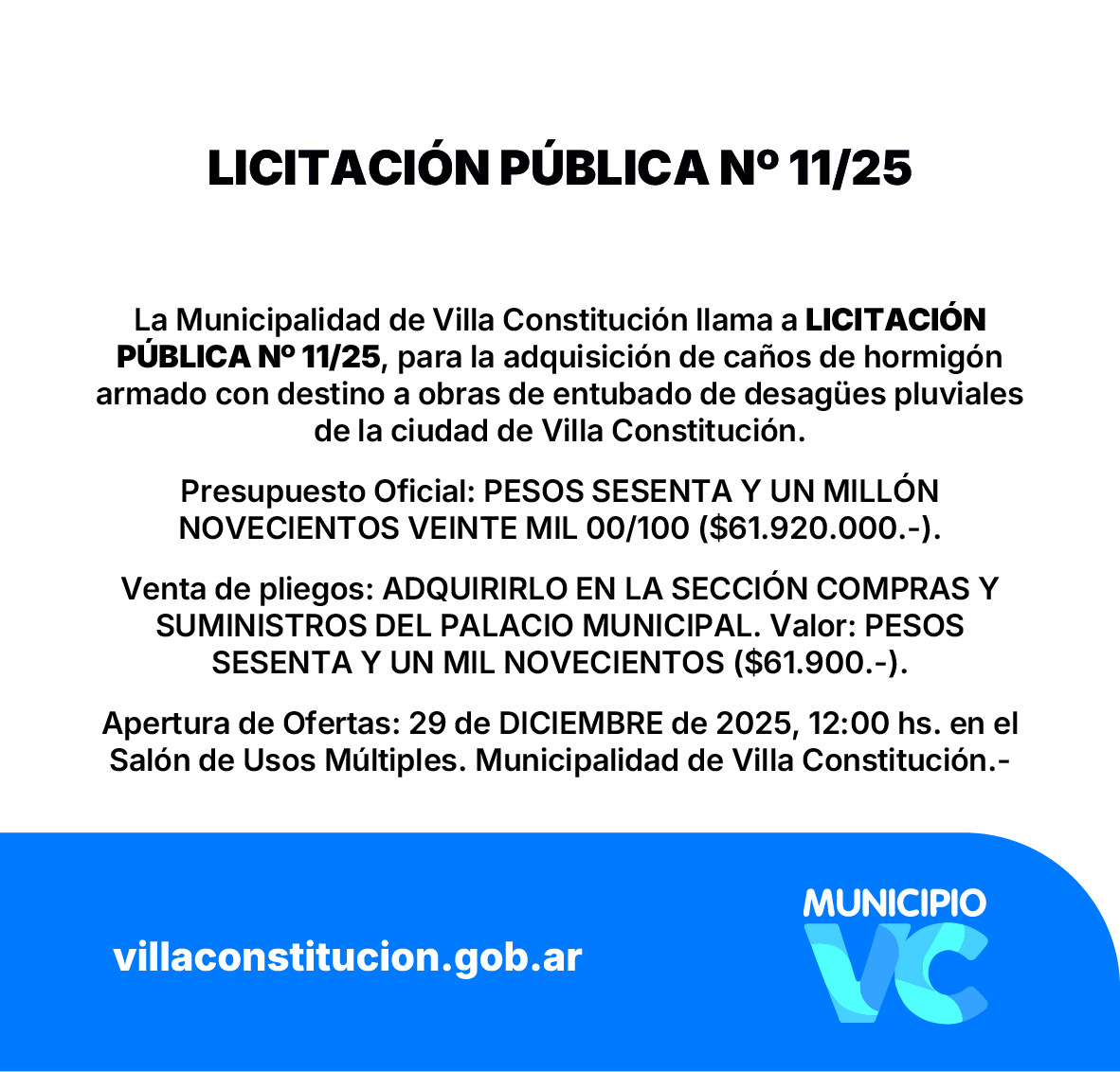 Apertura de Ofertas: 29 de DICIEMBRE de 2025, 12:00 hs. en el Salón de Usos Múltiples, Municipalidad de Villa Constitución.-