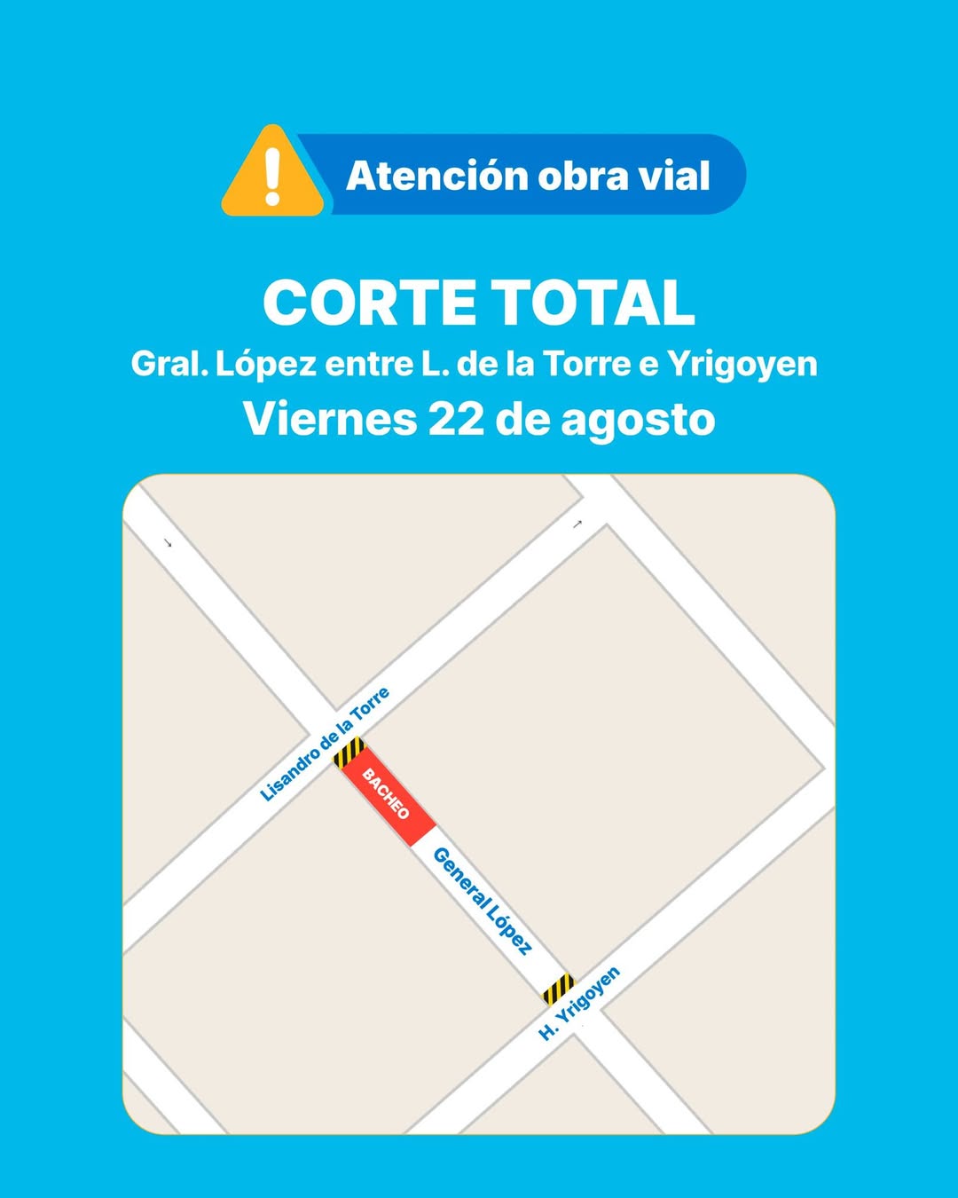 El viernes 22 de agosto, habrá corte total en calle General López, entre Lisandro de la Torre e Yrigoyen, durante 2 días.