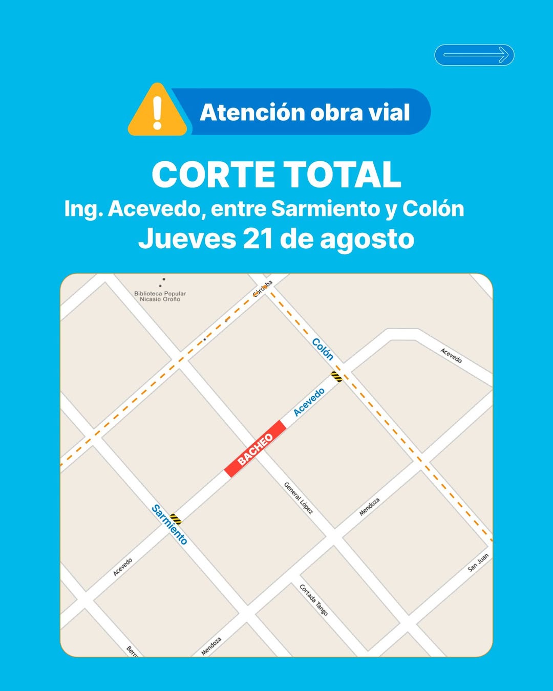 A partir del jueves 21 de agosto, se realizará un corte total en calle Ing. Acevedo, entre Sarmiento y Colón, por trabajos de bacheo.