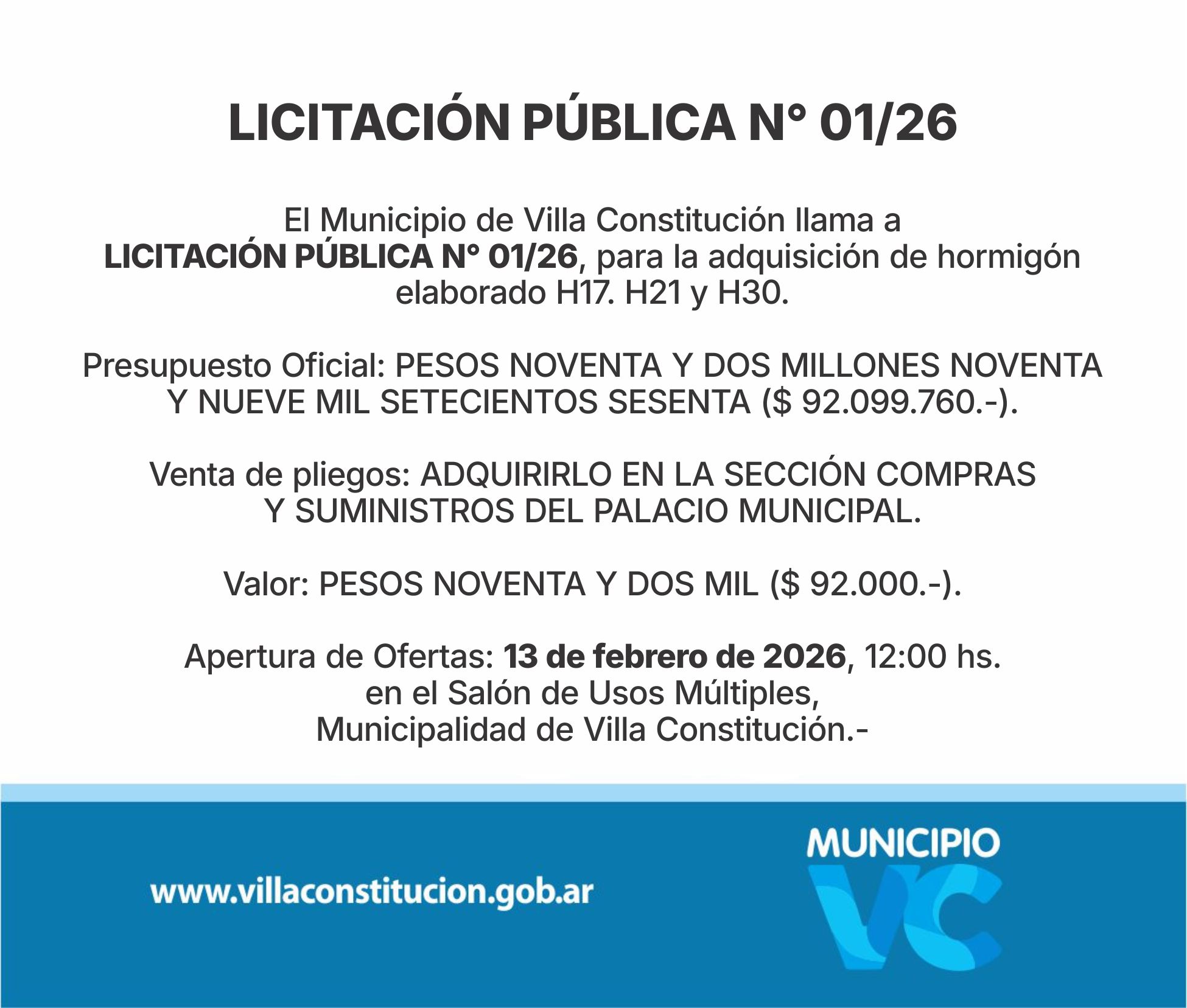 La Municipalidad de Villa Constitución llama a LICITACIÓN PÚBLICA N° 01/26, para la adquisición de hormigón elaborado H17. H21 y H30.