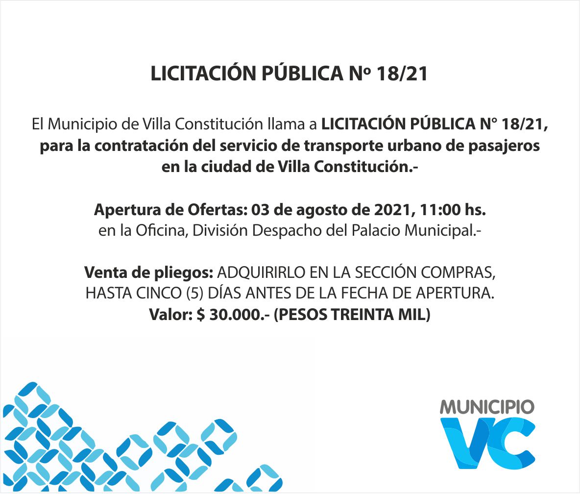 El Municipio de Villa Constitución llama a LICITACIÓN PÚBLICA N° 18/21, para la contratación del servicio de transporte urbano de pasajeros en la ciudad de Villa Constitución.-