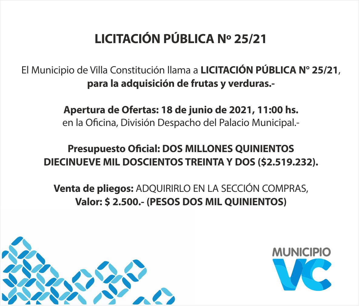 El Municipio Villa Constitución llama a LICITACIÓN PÚBLICA N° 25/21, para la adquisición de frutas verduras.-