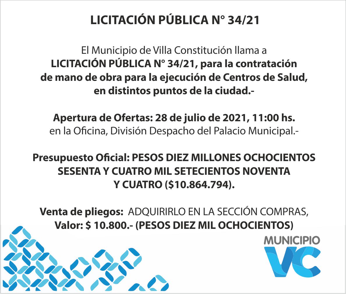 El Municipio de Villa Constitución llama a LICITACIÓN PÚBLICA N° 34/21, para la contratación de mano de obra para la ejecución de Centros de Salud, en distintos puntos de la ciudad.-