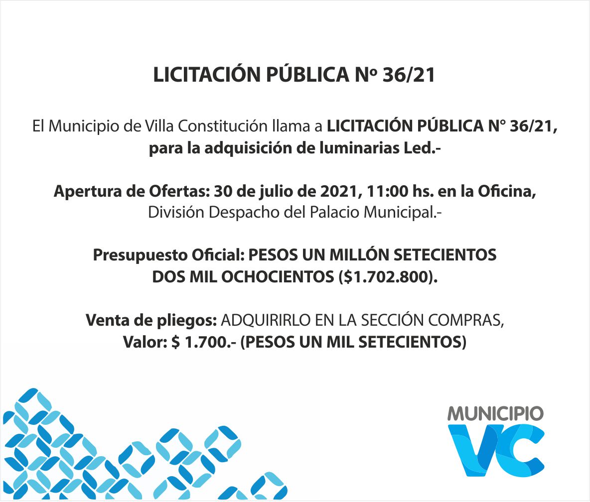 El Municipio de Villa Constitución llama a LICITACIÓN PÚBLICA N° 36/21, para la adquisición de luminarias Led.-