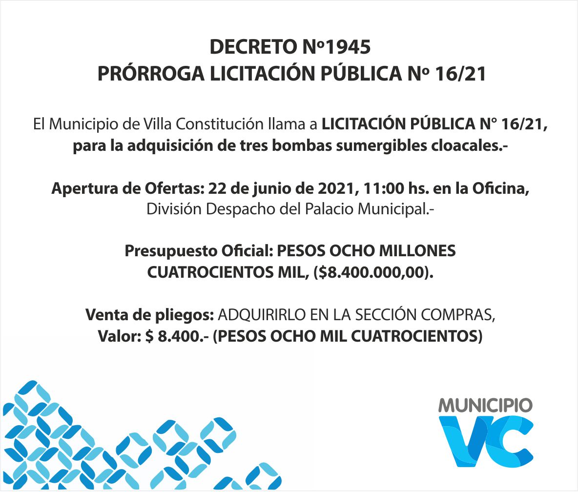 El Municipio Villa Constitución llama a LICITACIÓN PÚBLICA N° 16/21, para la adquisición de tres bombas sumergibles cloacales.-