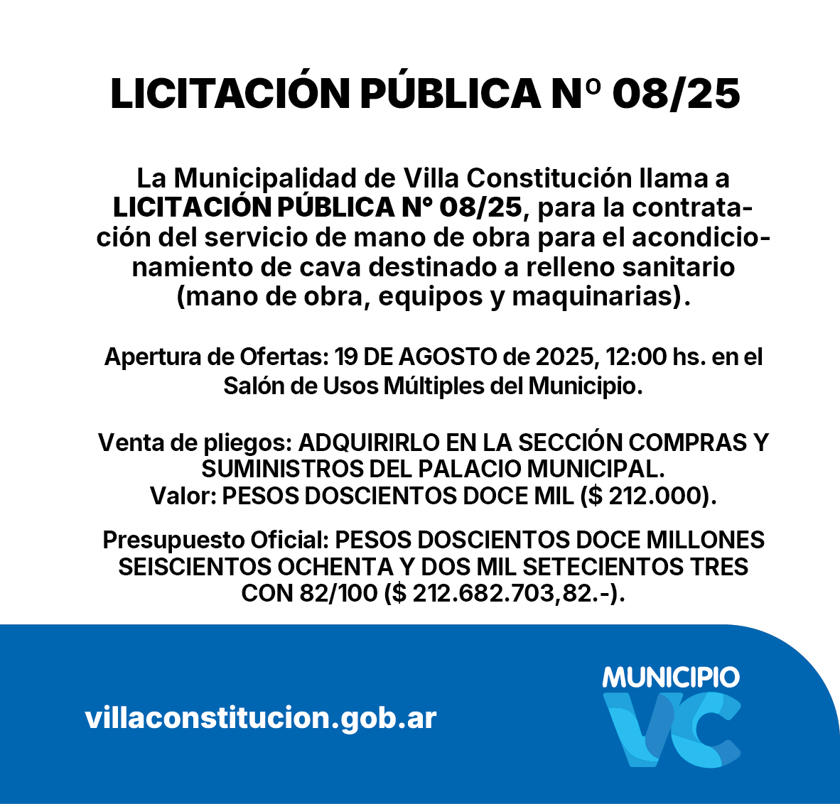 Apertura de Ofertas: 19 DE AGOSTO de 2025, 12:00 hs. en el Salón de Usos Múltiples, Municipalidad de Villa Constitución.-