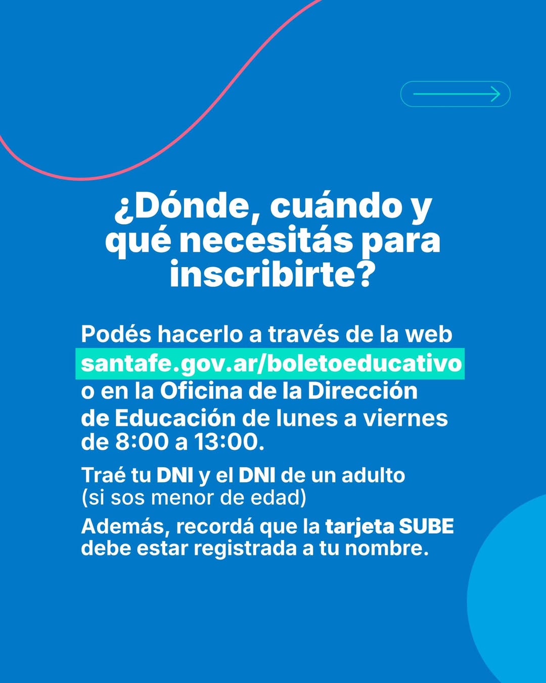 Ingresá a santafe.gob.ar/boletoeducativo y completá el formulario con tus datos, o acercate a la Oficina de Educación (en el Palacio Municipal) de lunes a viernes, de 08:00 a 13:00.